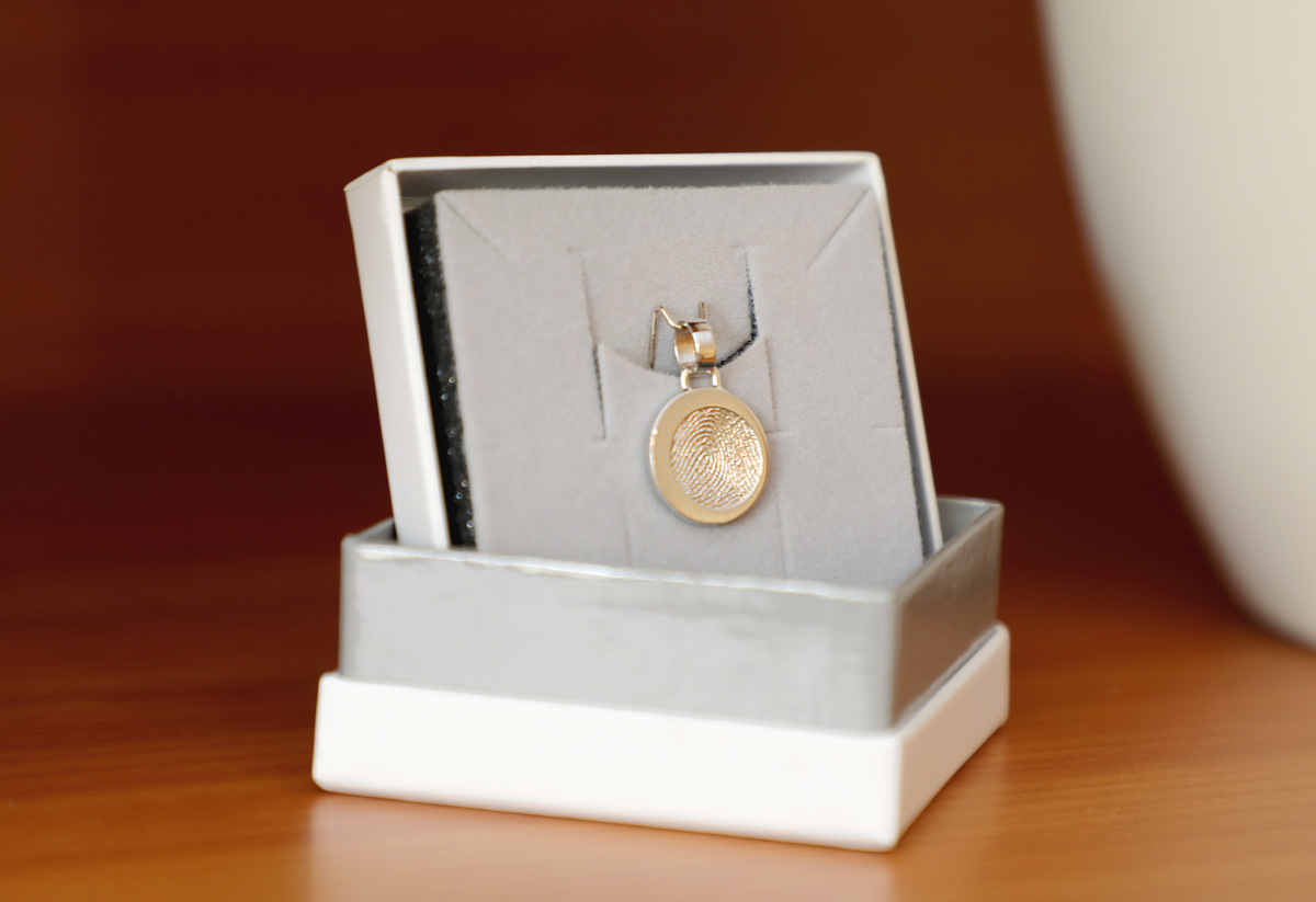 Aus dem Fingerabdruck kann ebenfalls ein Schmuckstück Ihrer Wahl entstehen. Der Abdruck kann in Gold oder Silber abgegossen werden und z. B. zu Anhängern, Ohrringen oder Ringen weiterverarbeitet werden. Auf diese Weise kann die Erinnerung an einen Menschen in einer greif- und fühlbaren Form bewahrt werden.